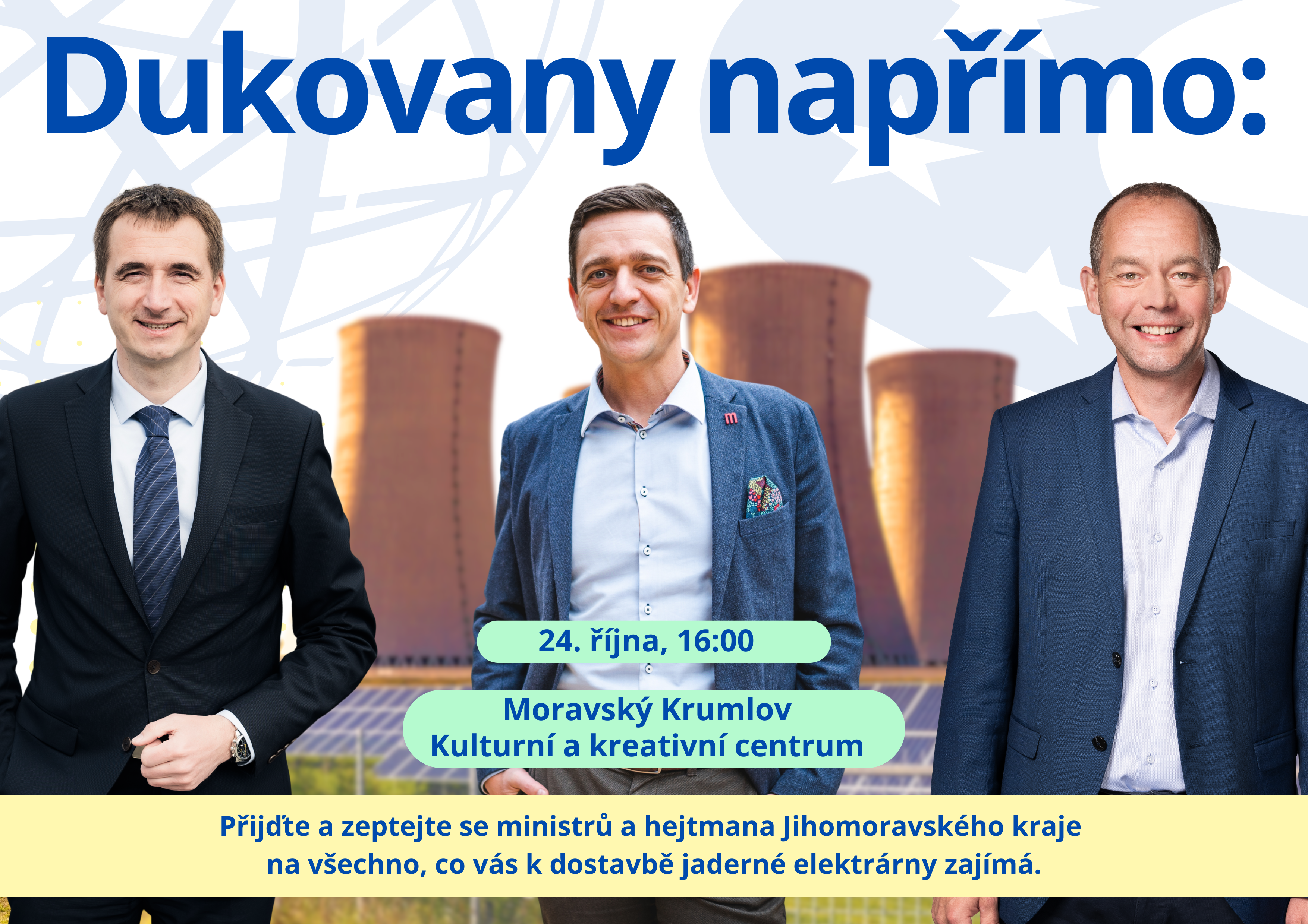 Zástupci JMK zvou na veřejnou debatu Dukovany napřímo, která se uskuteční v pátek 24.10.2025 od 16:00 hodin v Kulturním a kreativním centru Moravský Krumlov.
